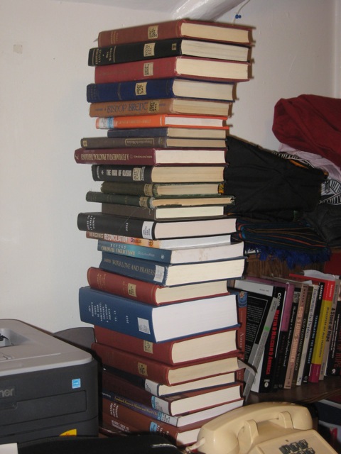 One of the advantages of a place like Yale is, naturally, the library, or, rather, libraries. In particularly, the divinity library has a wealth of mission-related materials – mission theology, mission history, mission memoirs. (A couple of the memoirs are in the rare books library, which makes me feel super-important when I go read those.) I have been taking full advantage of these resources while here. Perhaps too much advantage. Here’s the stack of library books on my desk at the moment. (When the pile starts falling over, then I’ll start returning them.)