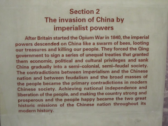 In Beijing, I visited the newly-reopened National Museum of China right on Tiananmen Square. The major exhibit there spans several galleries and is titled “The Road of Rejuvenation.” Most of the exhibit was in Mandarin and I’ll confess I didn’t understand it all. But the basic theme seemed to be that in the Opium Wars of the 1840s, the “imperialist” powers of the west took advantage of China and began to enforce a decades-long period of humiliating foreign rule. But the plucky people of China rose up and first, unsuccessfully, behind Sun Yat Sen and then, successfully, behind Mao, they threw off the foreign rulers, liberated themselves, and so set themselves on a path to grow into a “moderately prosperous” society. Rather than rising to a new place in the world, China is, with this recent growth, returning to its proper place in the world after a rough century or century and a half.